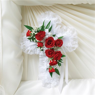 A tasteful memento of faith and love for the dearly departed to take with them. Our satin cross casket pillow, fashioned by our expert florists with a spray of radiant red spray roses and white ribbon, is a simple yet elegant arrangement and a touching ornamental gesture. •Cross-shaped satin casket pillow is adorned with a spray of red roses, baby’s breath, ribbon and soft, lush greenery •Measures approximately 9”L x 9”W •Appropriate for the funeral home •Our florists use only the freshest flowers available, so colors and varieties may vary